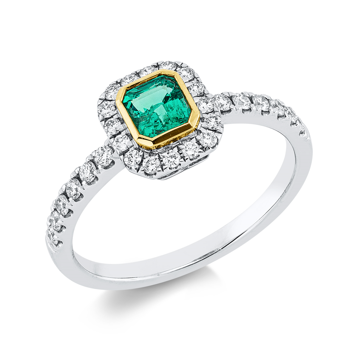 Ring 18 kt WG+GG, 28 Brillanten 0,28 ct, TW-si, 1 Smaragd 0,35 ct grün, Weite:53