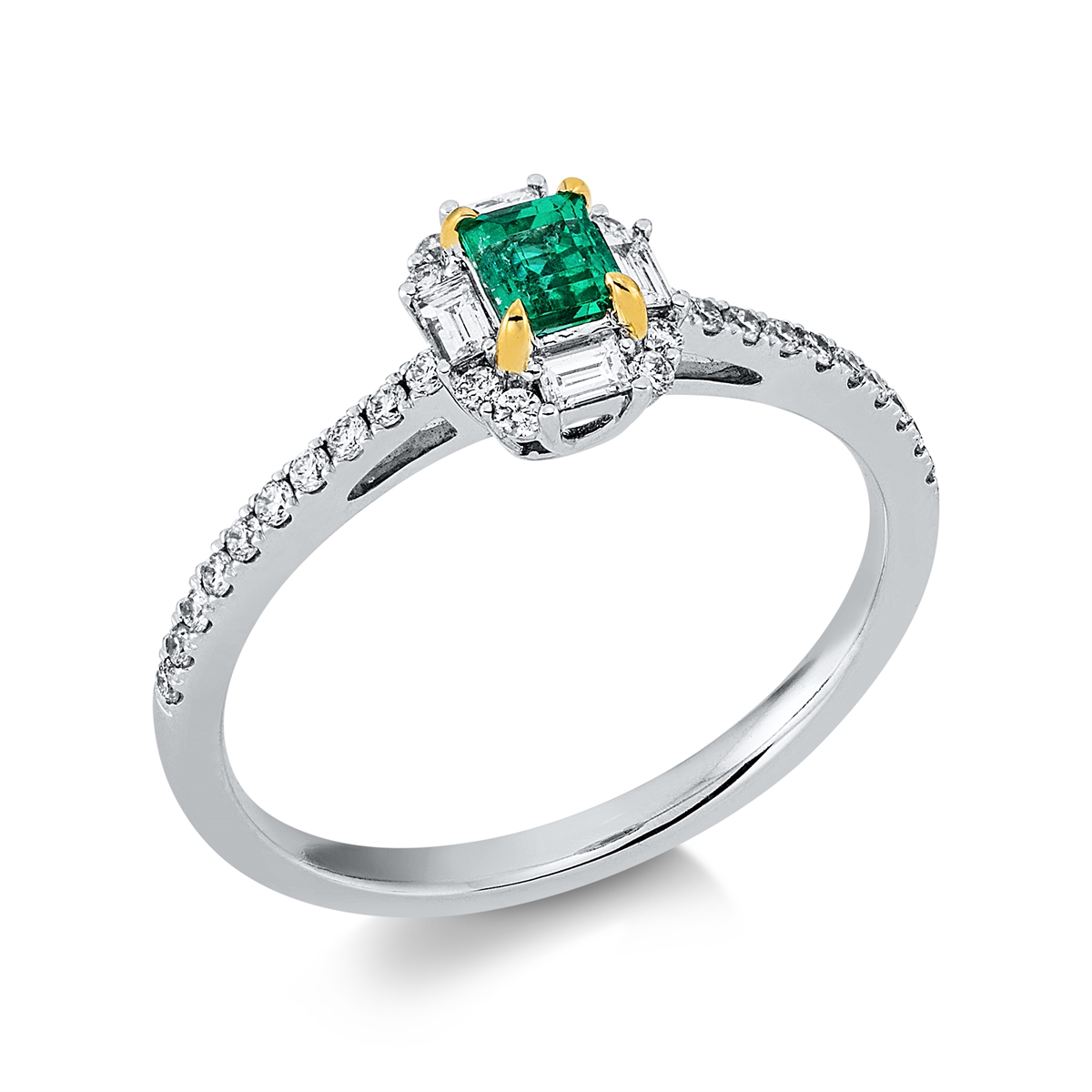 Ring 18 kt WG+GG, 4 Baguette 0,11 ct, TW-si, 28 Brillanten 0,17 ct, TW-si, 1 Smaragd 0,21 ct grün, H:6,2 mm, B:7,3 mm, Weite:53
