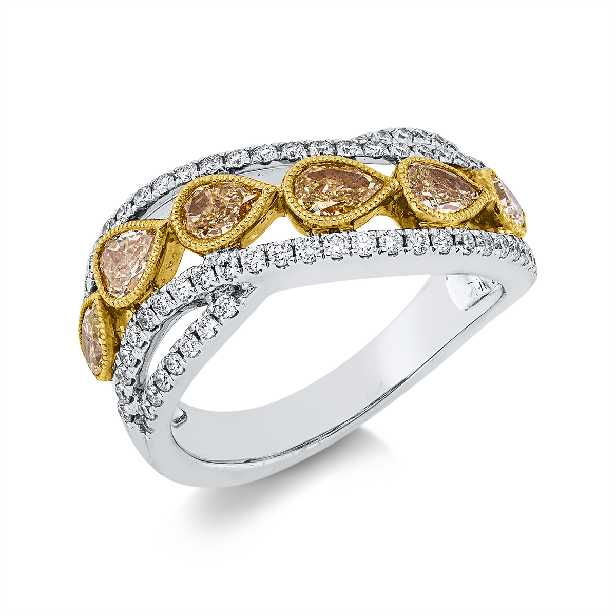 Ring 18 kt WG+GG, 66 Brillanten 0,40 ct, TW-si, 6 Tropfen 1,07 ct, gelb, B:8,4 mm, Weite:53