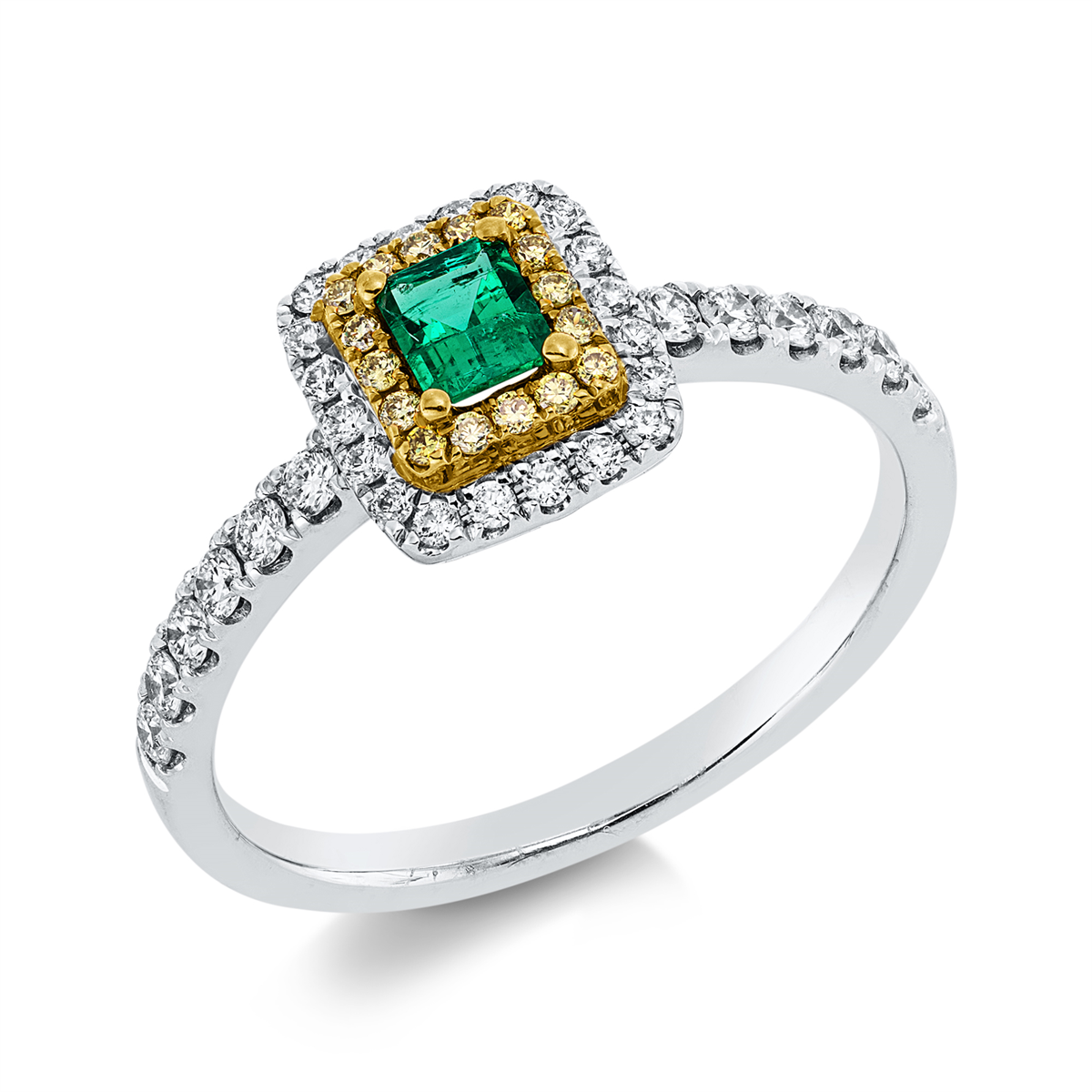 Ring 18 kt WG+GG, 32 Brillanten 0,29 ct, TW-si, 16 Brillanten 0,06 ct, gelb, 1 Smaragd 0,16 ct grün, Weite:53
