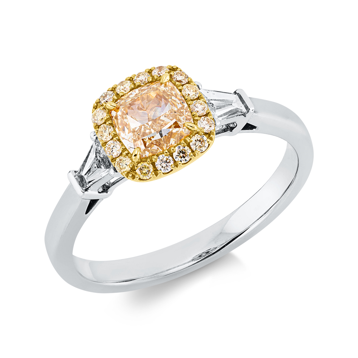Ring 18 kt WG+GG, 2 Trapeze 0,16 ct, TW-vsi, 1 Cushion 0,79 ct, gelb, 16 Brillanten 0,12 ct, gelb, Weite:54