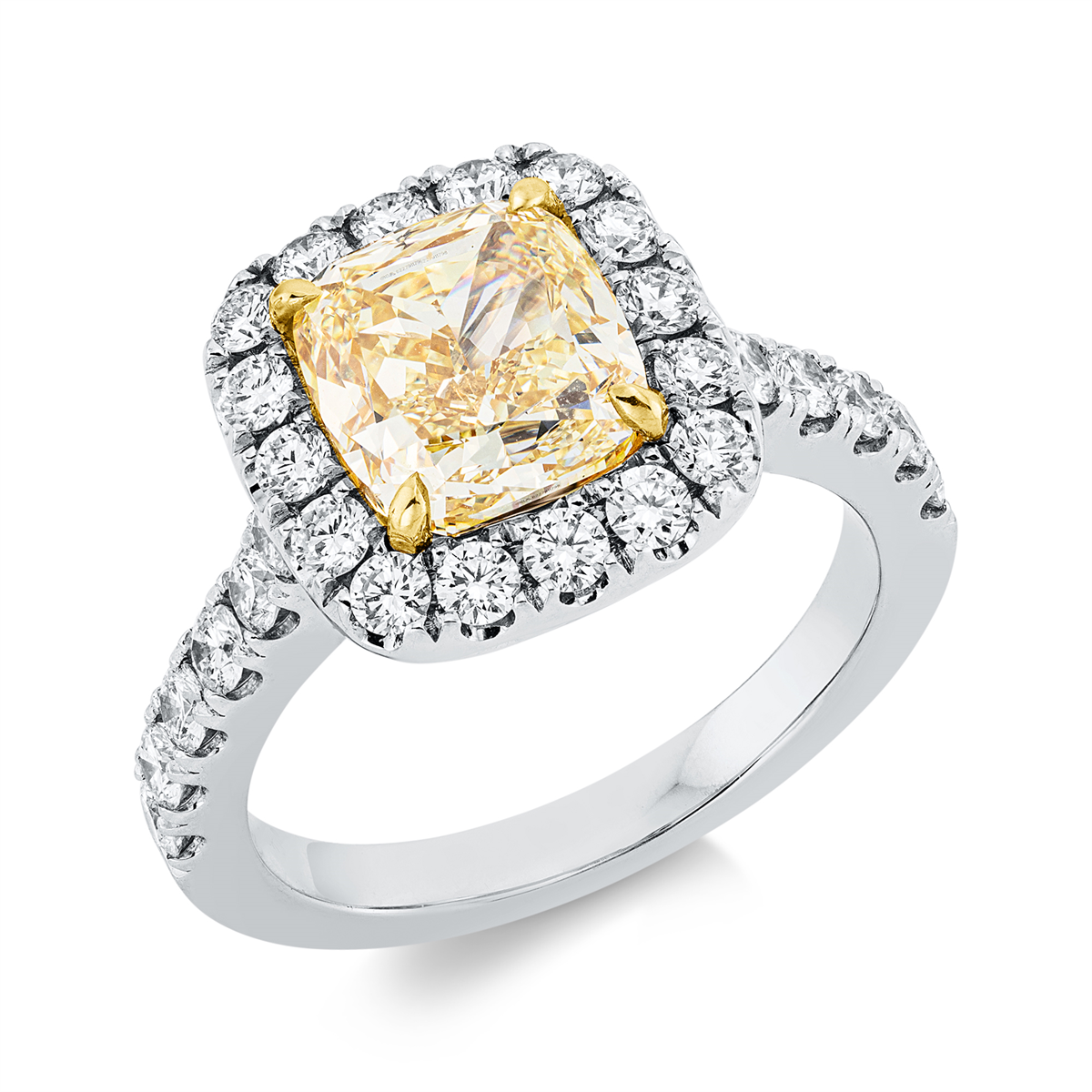 Ring 18 kt WG+GG, GIA 6227911798, 1 Cushion 3,01 ct, gelb-vs2, 28 Brillanten 1,05 ct, TW-vsi, Weite:55