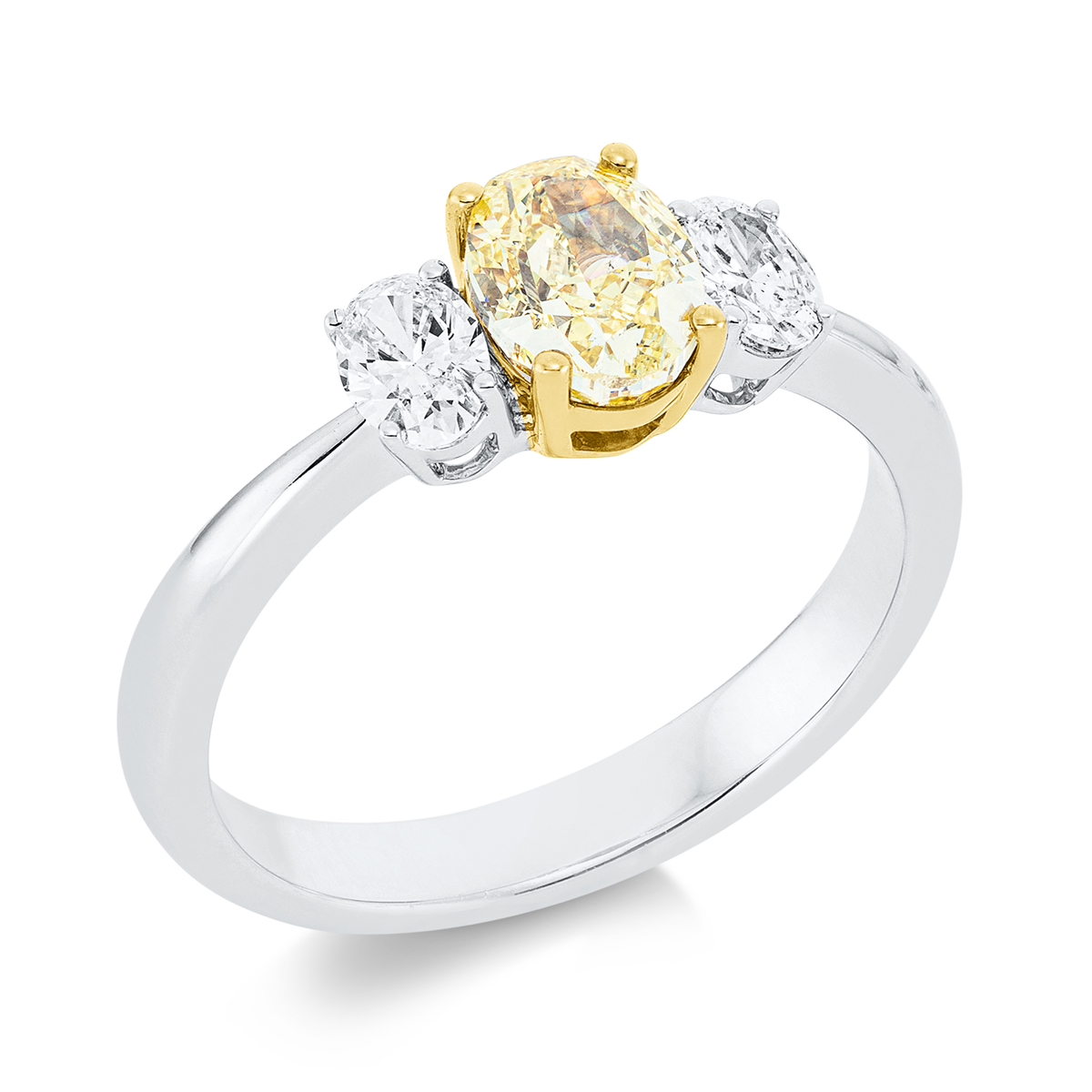Ring 18 kt WG+GG, GIA 7516571095, 1 Oval 1,01 ct, gelb-si1, 2 Oval 0,47 ct, TW-si, Weite:54