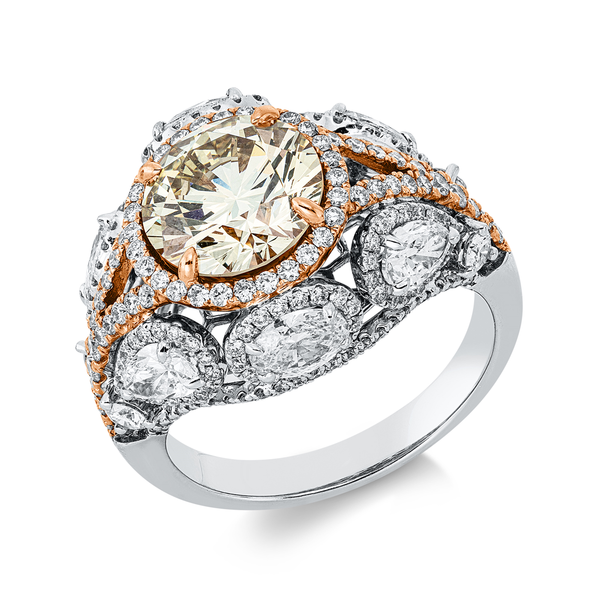 Ring 18 kt WG+RG, 4 Tropfen 0,74 ct, F-vsi, 2 Oval 0,48 ct, F-vsi, 212 Brillanten 0,93 ct, F-vsi, 1 Brill. 2,59 ct, gelb, B:16,1 mm, Weite:53