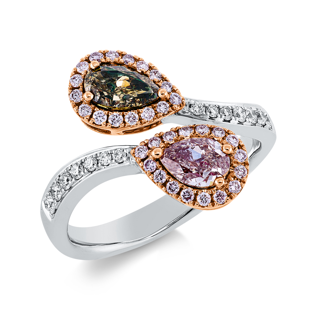 Ring 18 kt WG+RG, GIA6482933776, 14 Brillanten 0,18 ct, TW-si, 1 Tropfen 0,39 ct, pink, 1 Tropfen 0,50 ct, grün, 32 Brillanten 0,23 ct, pink, Weite:54
