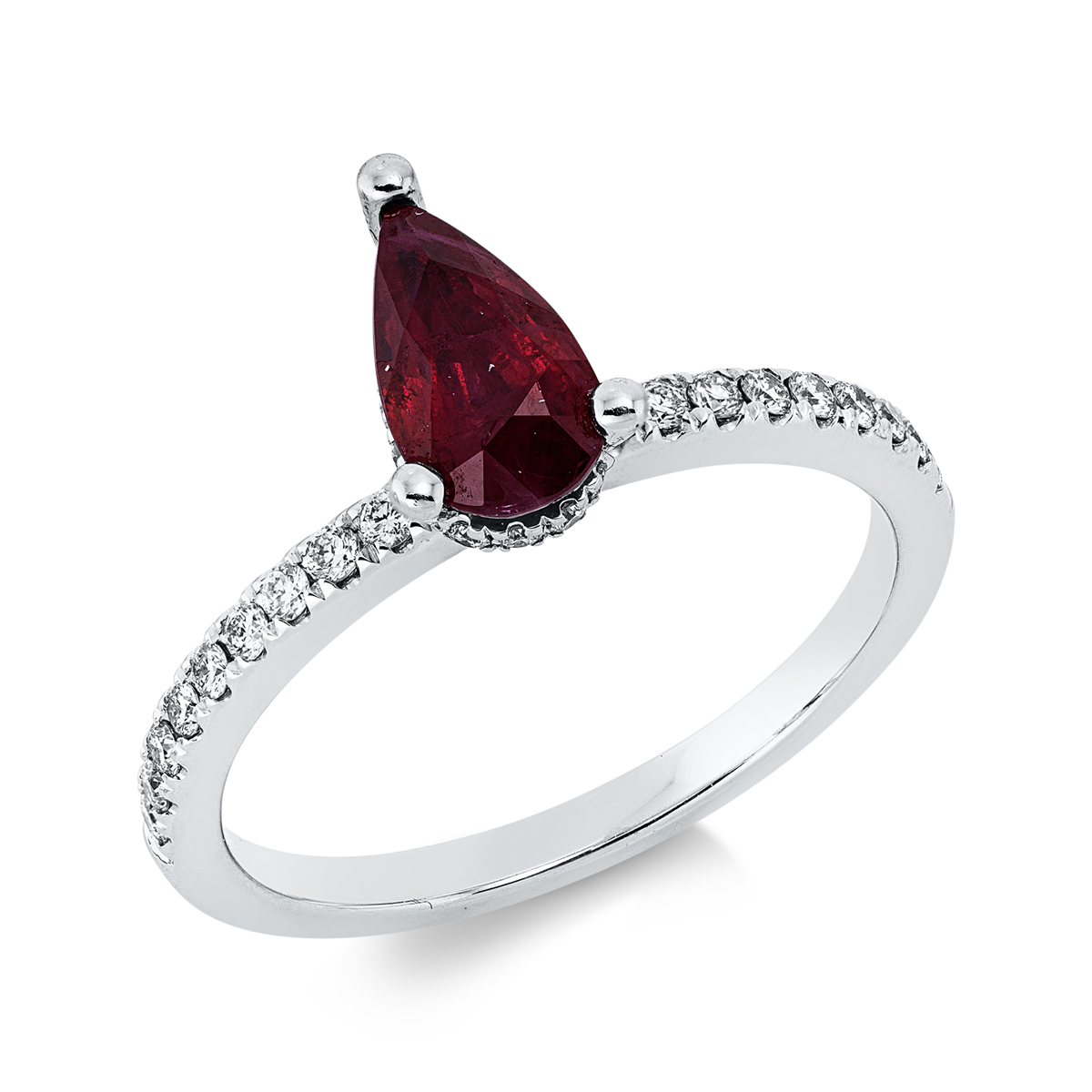 Ring 3er-Krappe 18 kt WG, 34 Brillanten 0,25 ct, TW-si, 1 Rubin 1,05 ct rot, Weite:53