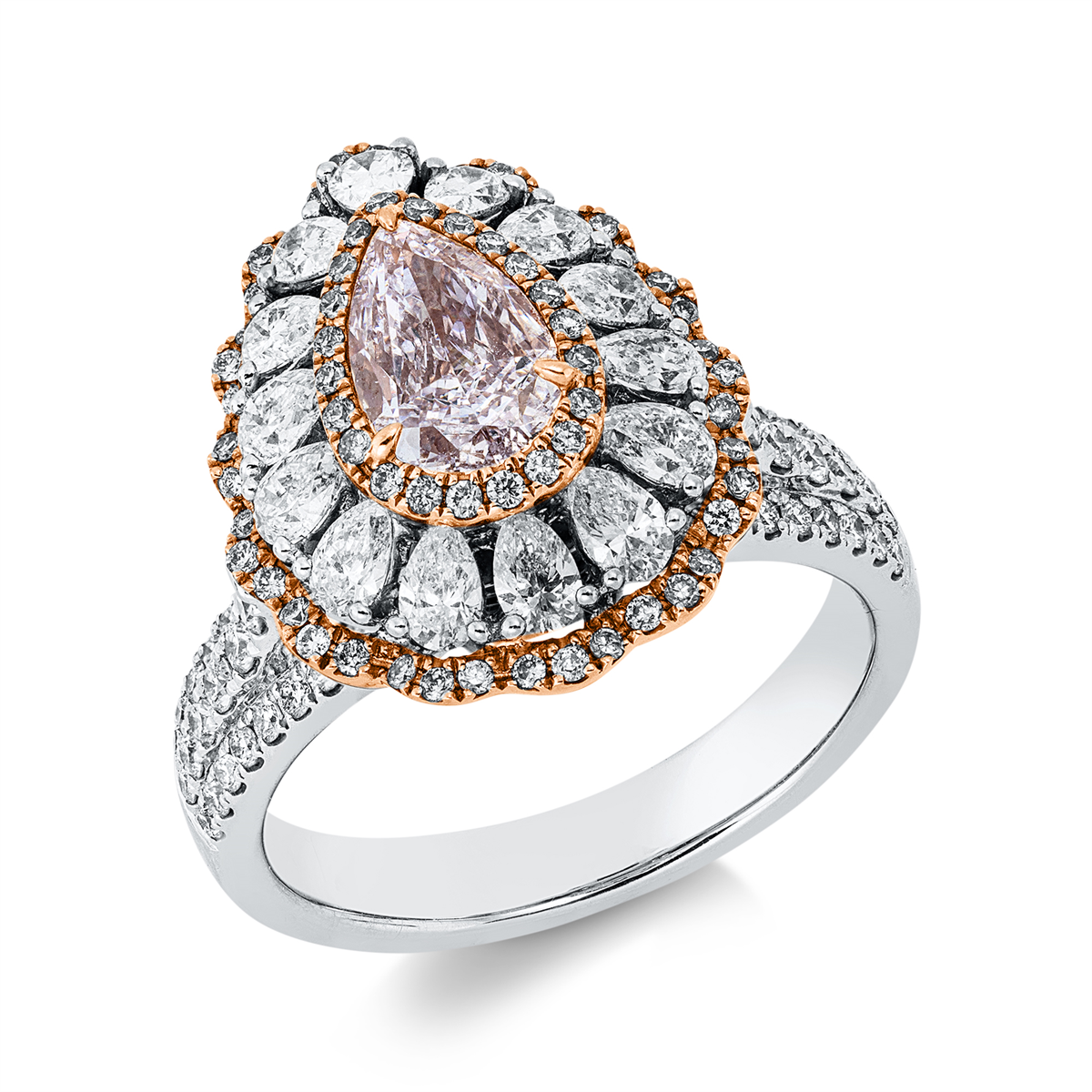 Ring 3er-Krappe 18 kt WG+RG, GIA 3465972443, 2 Trapeze 0,17 ct, TW-si, 24 Brillanten 0,17 ct, TW-si, 1 Tropfen 1,03 ct, pink, 18 Brillanten 0,12 ct, pink, H:14,0 mm, B:17,7 mm, Weite:54