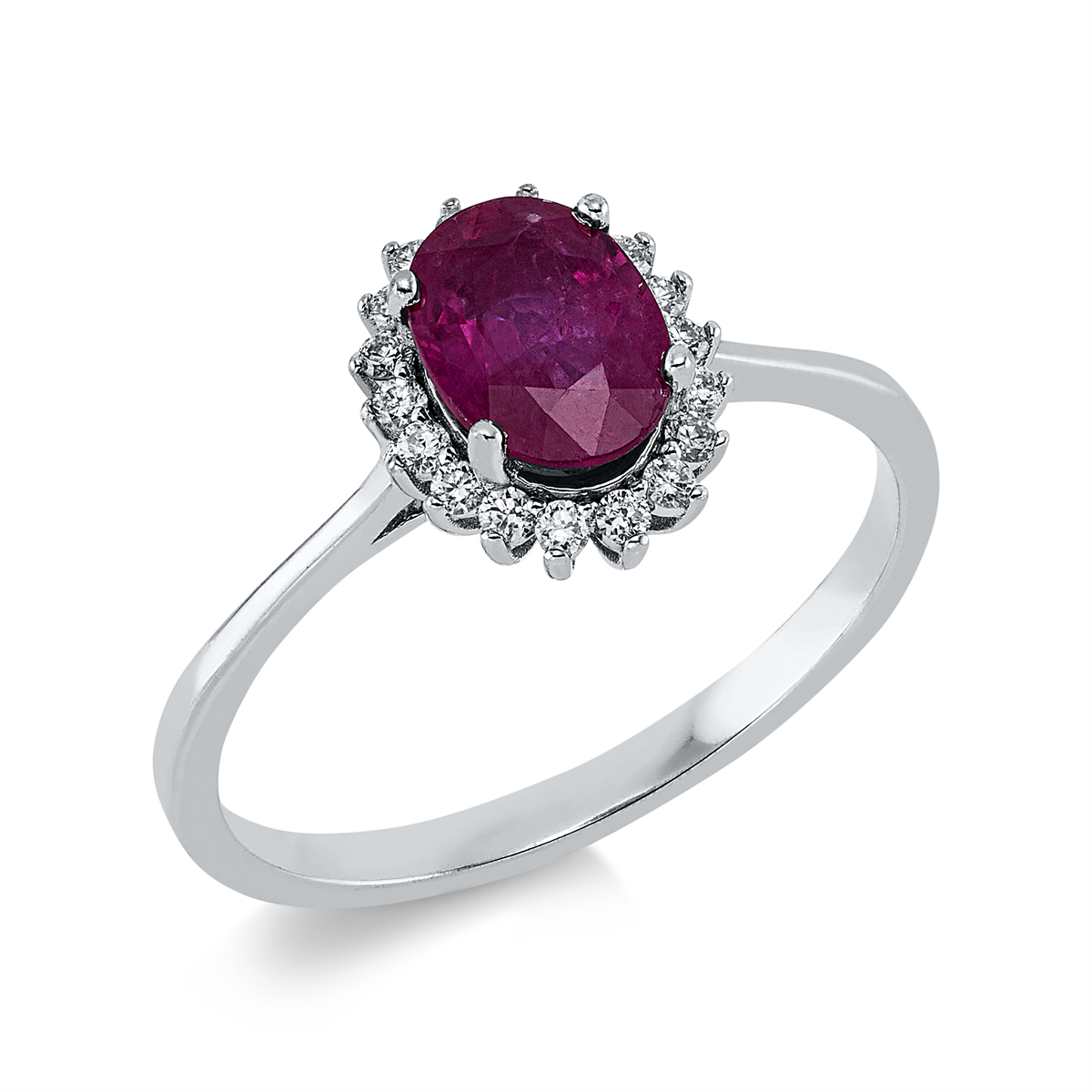 Ring 4er-Krappe 14 kt WG, 18 Brillanten 0,13 ct, F-si, 1 Rubin 0,83 ct rot, H:8,0 mm, B:9,7 mm, Weite:54