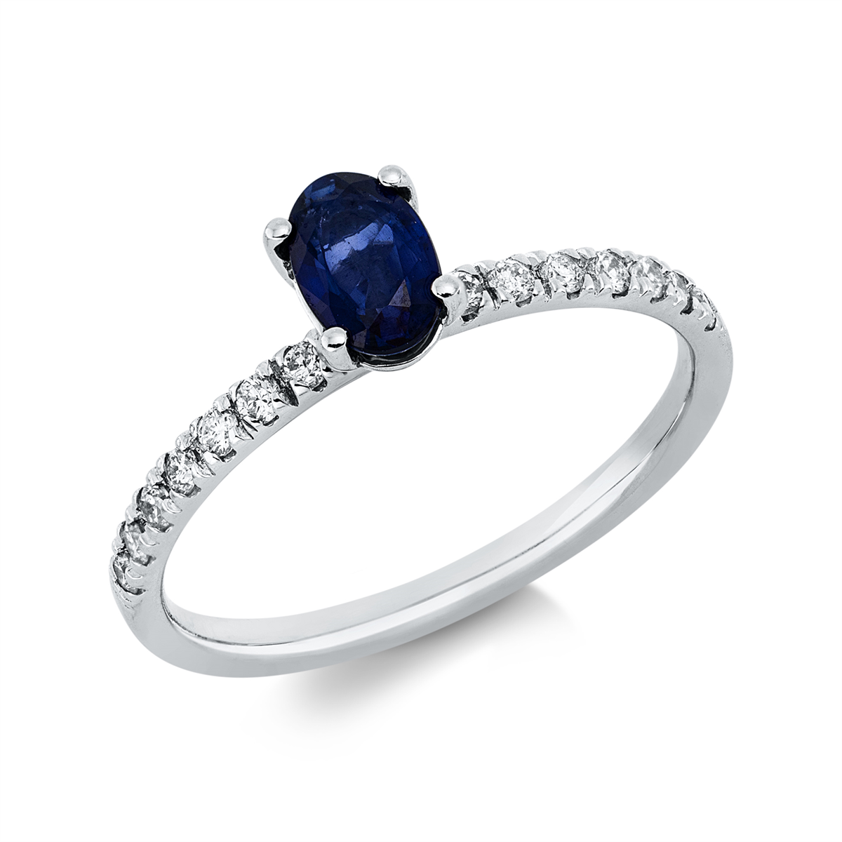 Ring 4er-Krappe 14 kt WG, 14 Brillanten 0,17 ct, F-si, 1 Saphir 0,42 ct blau, Weite:49,5