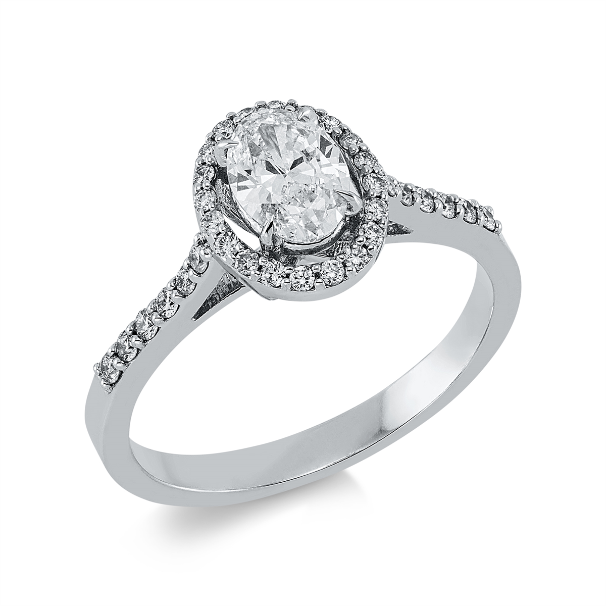 Ring 4er-Krappe 14 kt WG, HRD 230000093292, 1 Oval 0,51 ct, E-si1, 32 Brillanten 0,21 ct, F-si, Weite:53