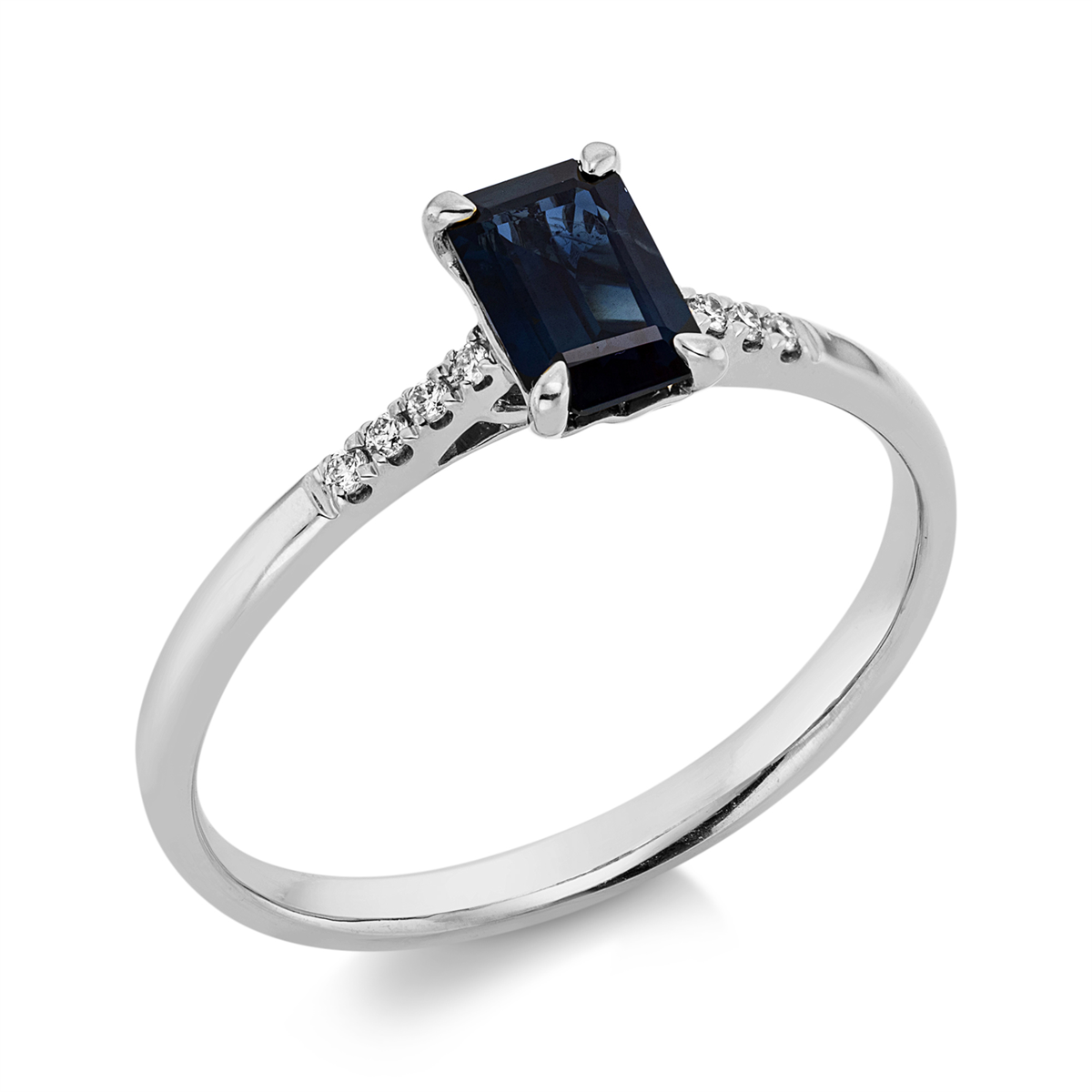 Ring 4er-Krappe 18 kt GG, 8 Brillanten 0,04 ct, TW-si, 1 Saphir 0,65 ct blau, H:4,5 mm, B:6,4 mm, Weite:54