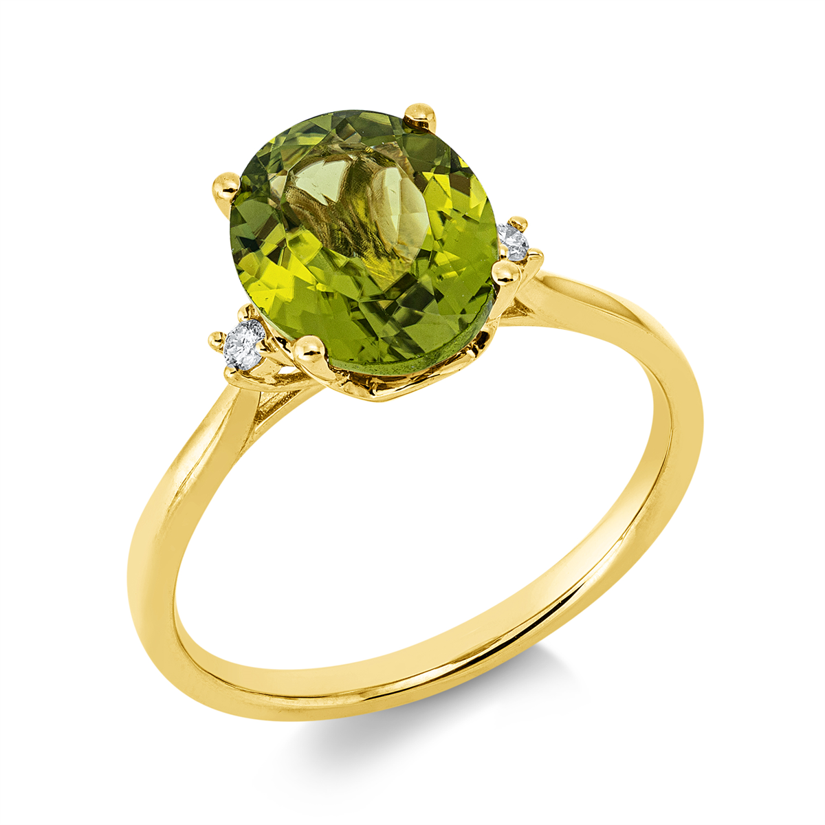 Ring 4er-Krappe 18 kt GG, 2 Brillanten 0,04 ct, TW-si, 1 Peridot 2,75 ct grün, H:8,4 mm, B:10,3 mm, Weite:54