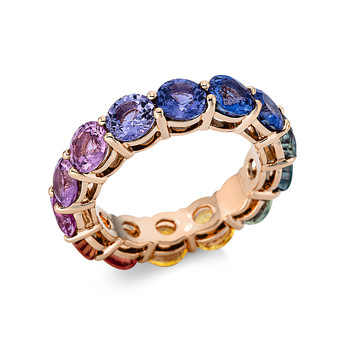 Ring 4er-Krappe 18 kt RG, 14 Saphire 8,35 ct fancy, B:4,3 mm, Weite:53