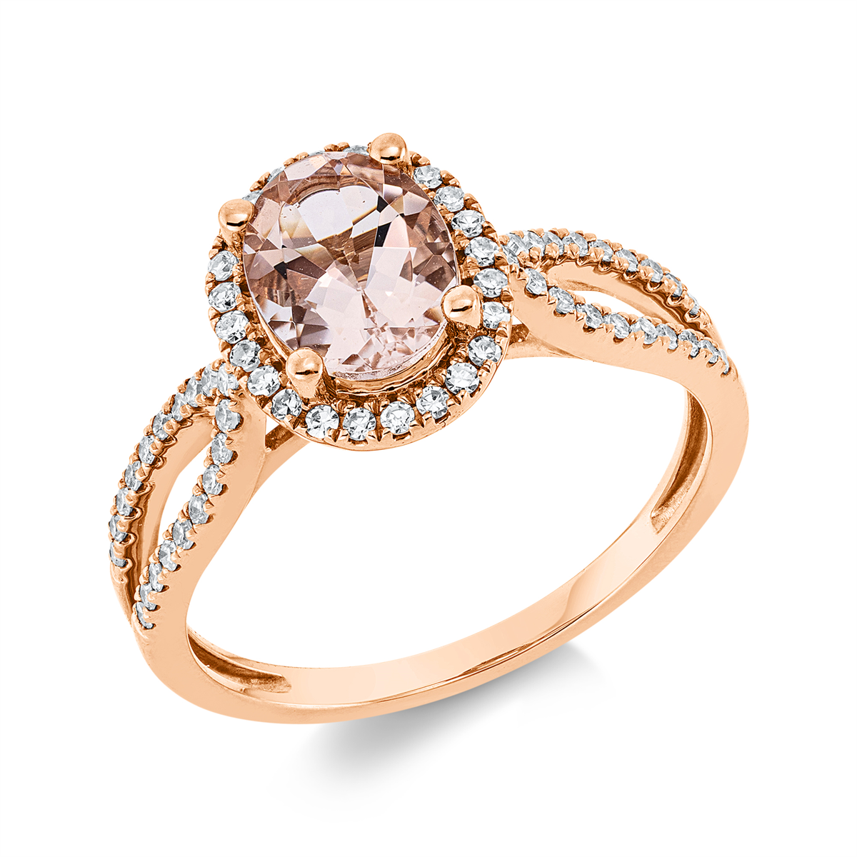 Ring 4er-Krappe 18 kt RG, 62 Diamanten 0,24 ct, TW-si, 1 Morganit 1,04 ct rosa, Weite:54
