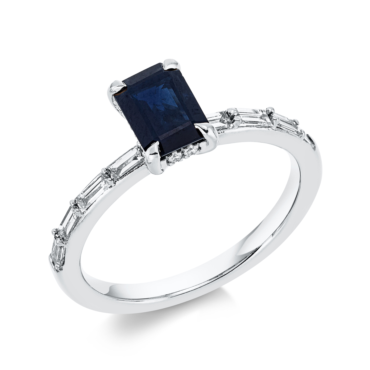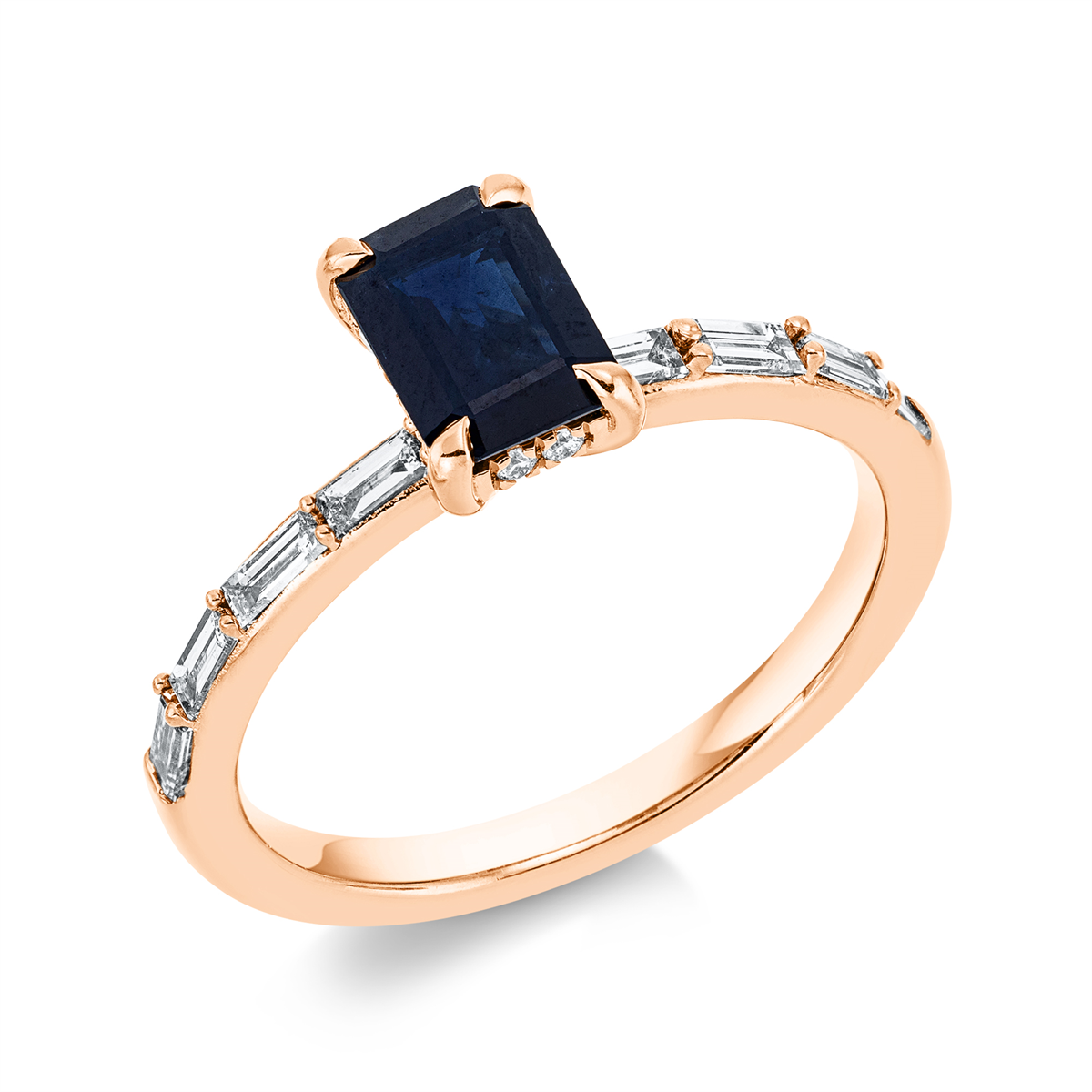 Ring 4er-Krappe 18 kt RG, 8 Baguette 0,33 ct, TW-si, 12 Brillanten 0,07 ct, TW-si, 1 Saphir 1,10 ct blau, Weite:54