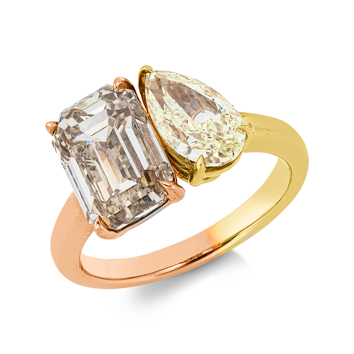 Ring 4er-Krappe 18 kt RG+GG, GIA6223241477, 1 Sm.schliff 4,04 ct, braun-si, 1 Tropfen 1,50 ct, gelb-vvs2, H:13,4 mm, Weite:54