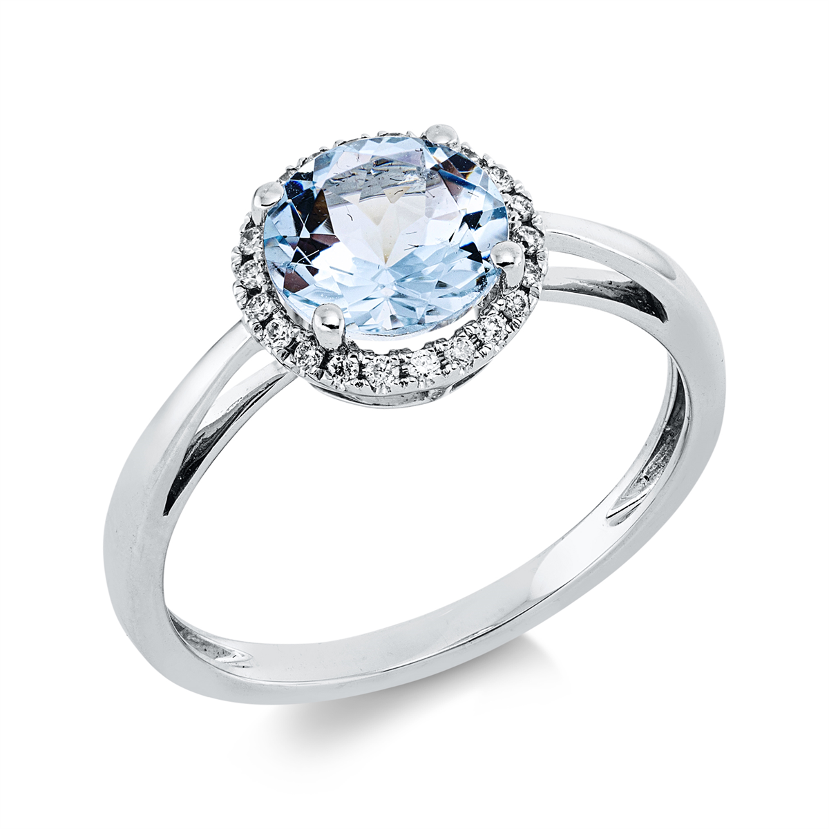 Ring 4er-Krappe 18 kt WG, 22 Brillanten 0,10 ct, TW-si, 1 Aquamarin 1,30 ct blau, Weite:53