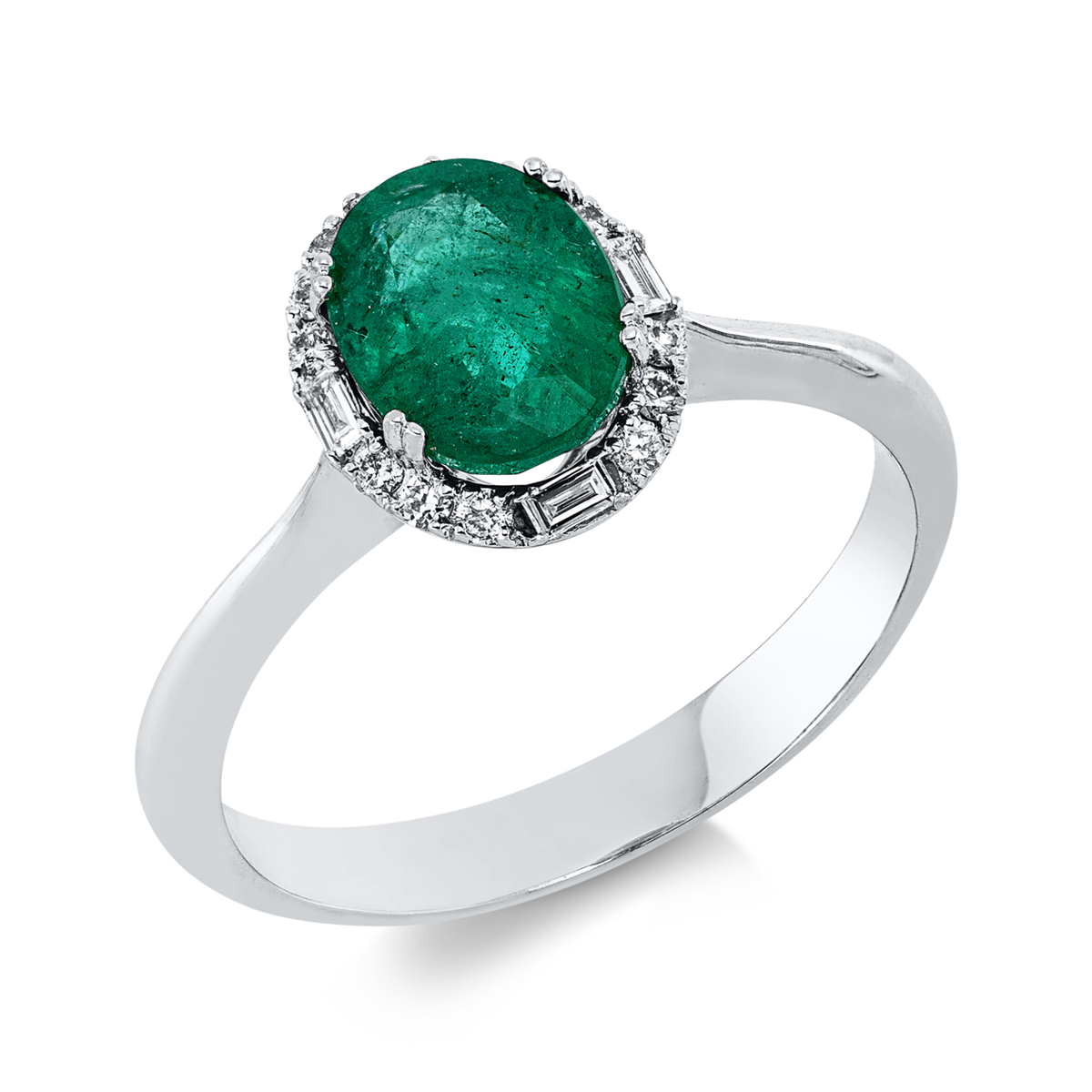 Ring 4er-Krappe 18 kt WG, 4 Baguette 0,05 ct, F-vsi, 12 Brillanten 0,09 ct, F-si, 1 Smaragd 1,32 ct grün, H:8,5 mm, B:10,0 mm, Weite:54