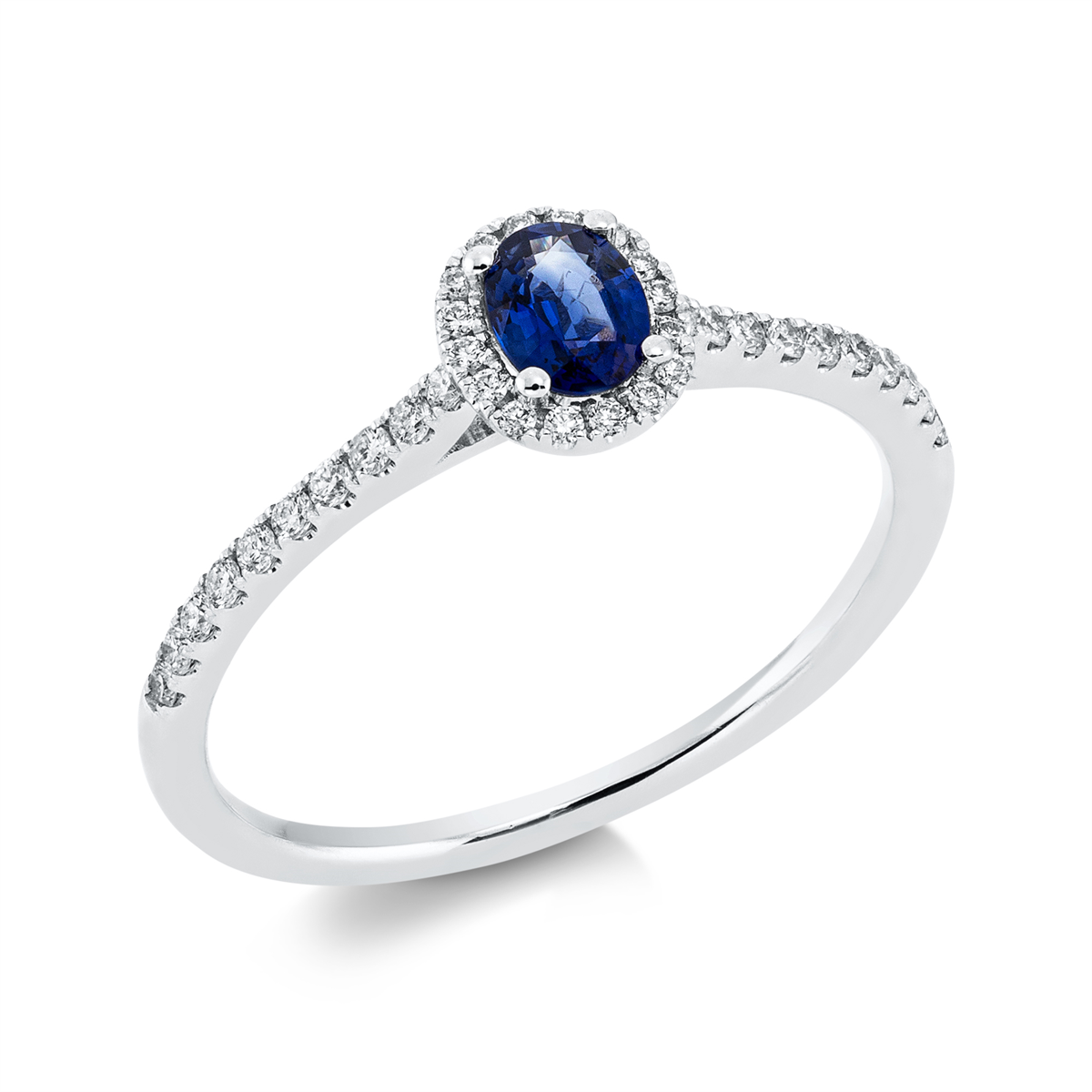 Ring 4er-Krappe 18 kt WG, 36 Brillanten 0,18 ct, TW-si, 1 Saphir 0,32 ct blau, Weite:53
