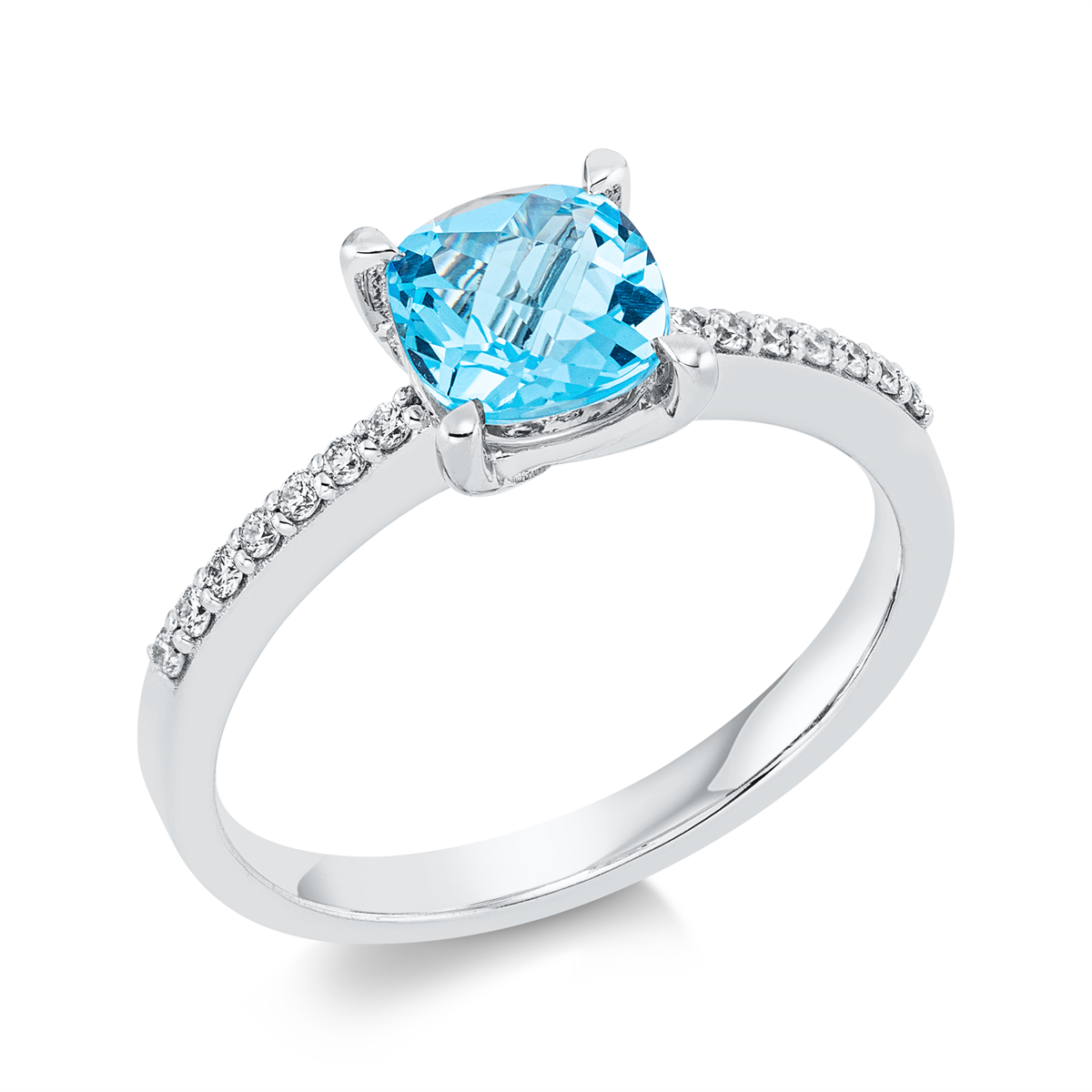 Ring 4er-Krappe 18 kt WG, 14 Brillanten 0,10 ct, TW-si, 1 Topas 1,17 ct blau, Weite:52