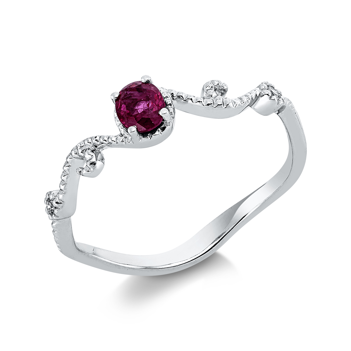 Ring 4er-Krappe 18 kt WG, 2 Brillanten 0,02 ct, TW-si, 1 Rubin 0,30 ct rot, Weite:53