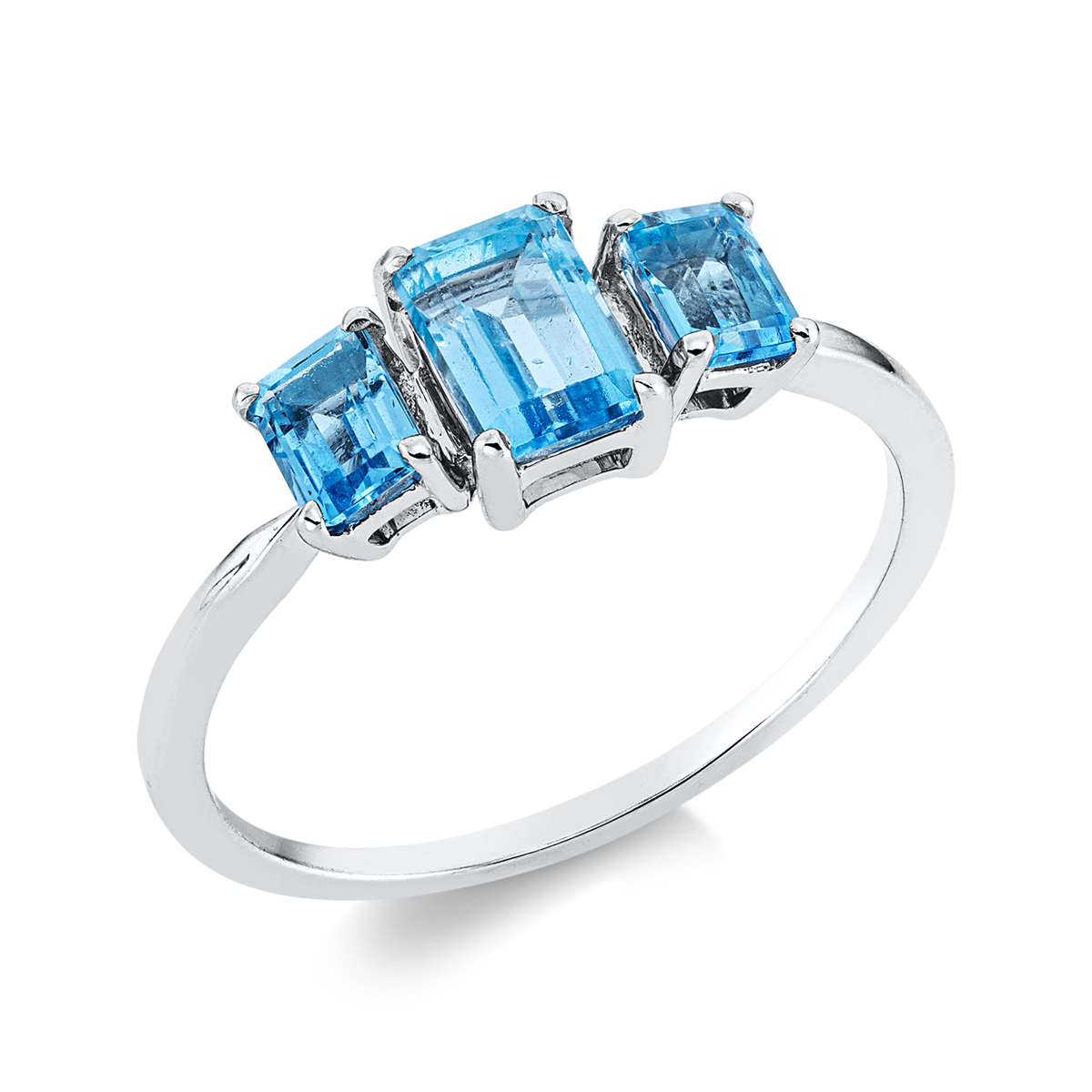 Ring 4er-Krappe 18 kt WG, 1 Topas 0,60 ct sky blue, 2 Topase 0,50 ct sky blue, H:6,4 mm, B:12,5 mm, Weite:54