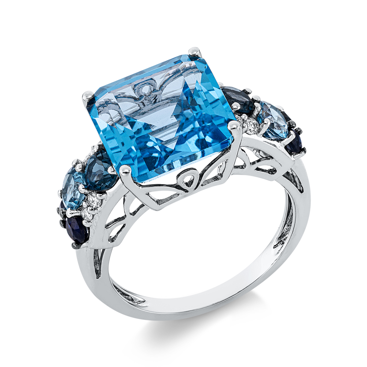 Ring 4er-Krappe 18 kt WG, 8 Brillanten 0,13 ct, TW-si, 2 Topase 0,50 ct Lond. blue, 3 Topase 8,70 ct blau, 4 Saphire 0,45 ct blau, Weite:54