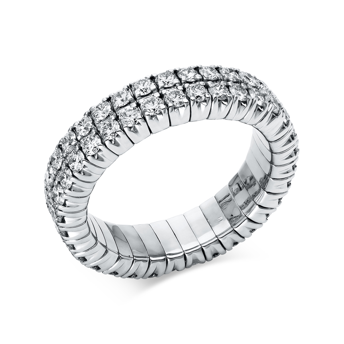 Ring 4er-Krappe 18 kt WG, Flex-Band, variabel, rhodinier, 64 Brillanten 1,69 ct, TW-si, Weite:53