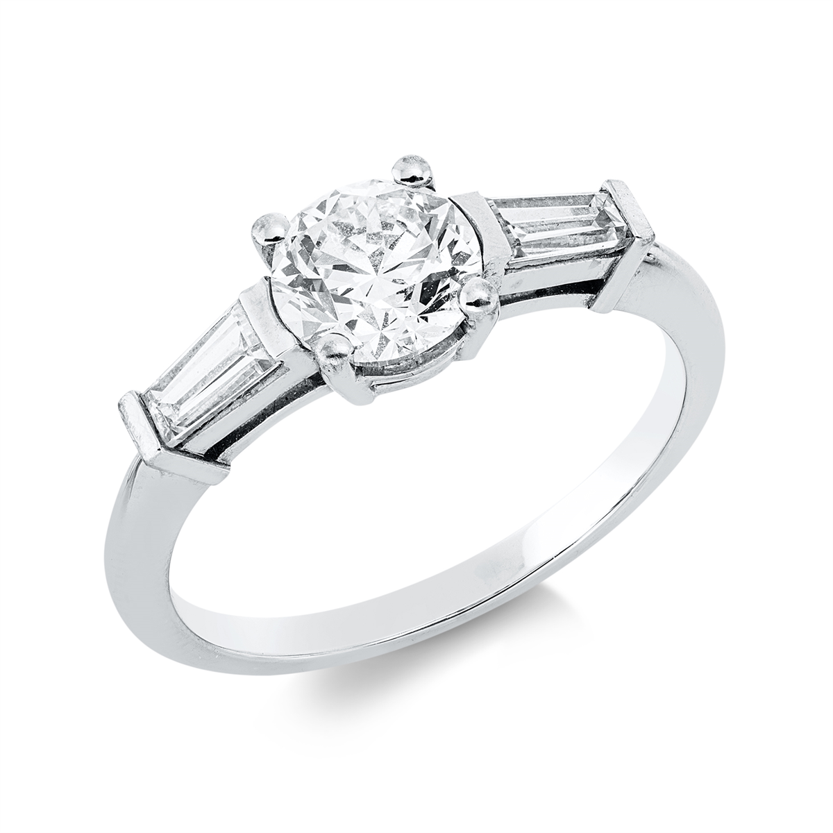 Ring 4er-Krappe 18 kt WG, GIA7502594971, 1 Brill. 1,00 ct, F-vsi, 2 Trapeze 0,43 ct, TW-vsi, H:16,8 mm, B:6,2 mm, Weite:55