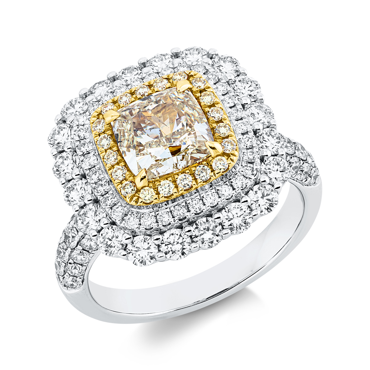 Ring 4er-Krappe 18 kt WG+GG, GIA 2146165185, 22 Brillanten 0,94 ct, TW-si, 60 Brillanten 0,54 ct, TW-si, 1 Cushion 1,59 ct, gelb-i1, 20 Brillanten 0,14 ct, gelb, H:16,1 mm, B:16,1 mm, Weite:53