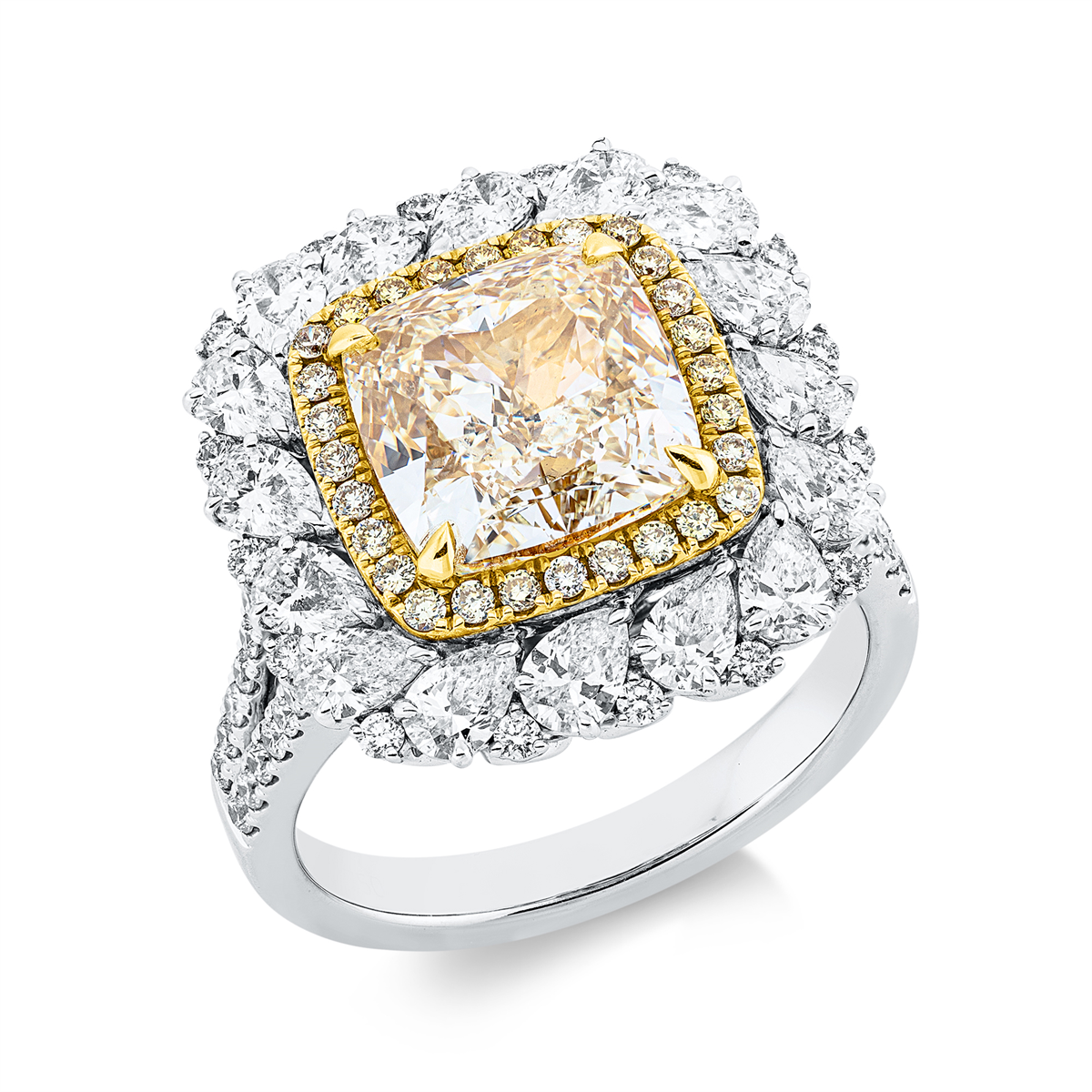 Ring 4er-Krappe 18 kt WG+GG, GIA 6292511218, 16 Tropfen 1,43 ct, TW-vvs, 47 Brillanten 0,39 ct, TW-vsi/si, 1 Cushion 4,09 ct, gelb-vs2, 28 Brillanten 0,19 ct, gelb, H:17,5 mm, B:17,7 mm, Weite:53