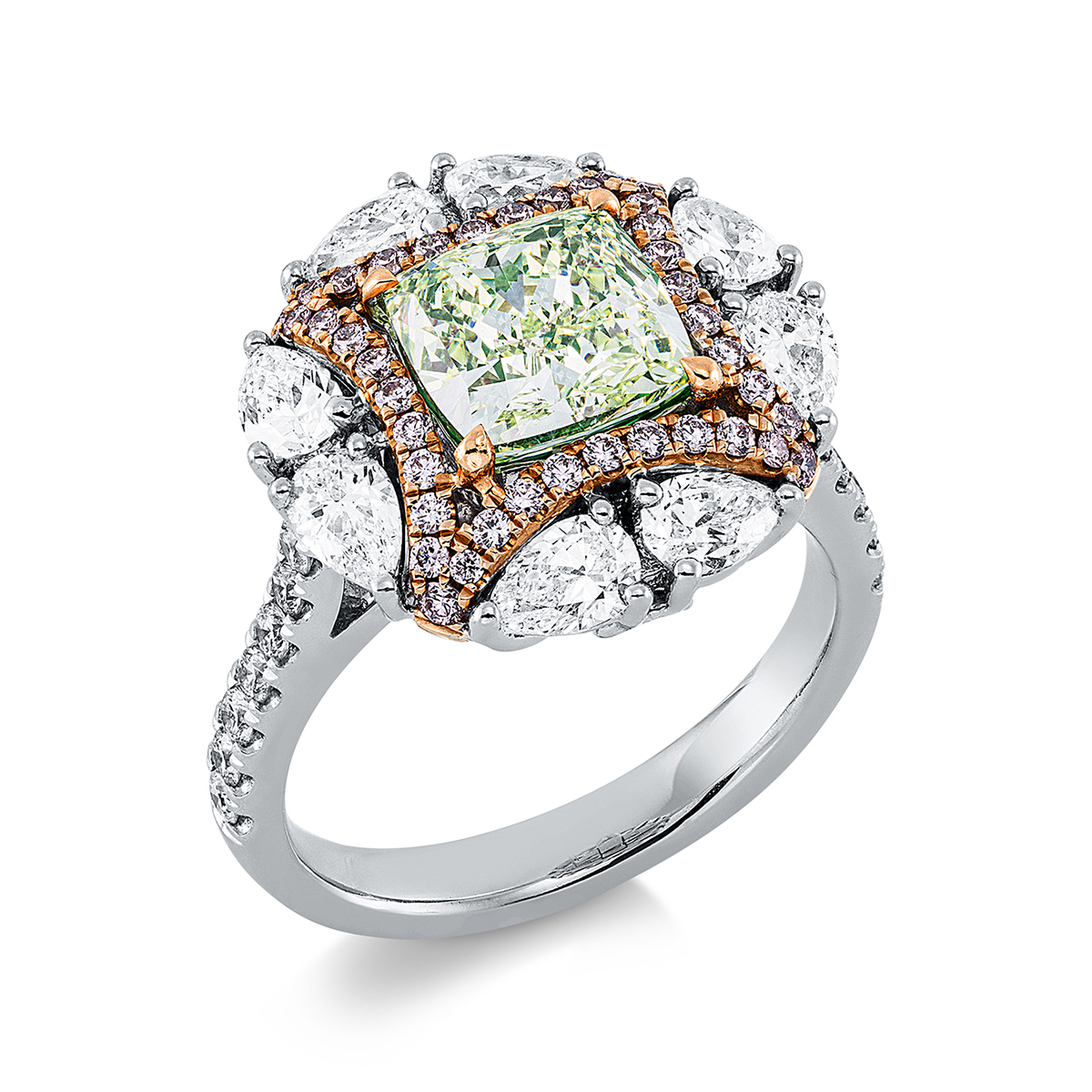 Ring 4er-Krappe 18 kt WG+RG, GIA 2176083038, 14 Brillanten 0,26 ct, TW-si, 8 Tropfen 1,13 ct, F-vsi, 1 Cushion 2,22 ct, grün-vsi, 40 Brillanten 0,24 ct, pink, Weite:53