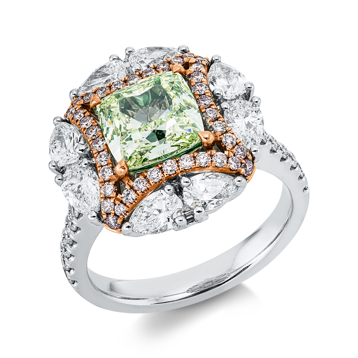 Ring 4er-Krappe 18 kt WG+RG, GIA 2176083038, 14 Brillanten 0,26 ct, TW-si, 8 Tropfen 1,13 ct, F-vsi, 1 Cushion 2,22 ct, grün-vsi, 40 Brillanten 0,24 ct, pink, Weite:53