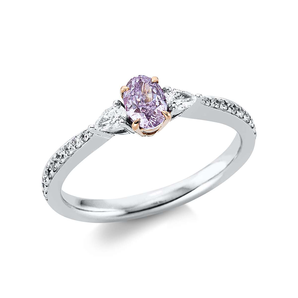 Ring 4er-Krappe 18 kt WG+RG, GIA1213784405, 20 Brillanten 0,18 ct, TW-si, 2 Tropfen 0,12 ct, F-pi, 1 Oval 0,42 ct, pink-i1, H:10,5 mm, B:5,2 mm, Weite:53