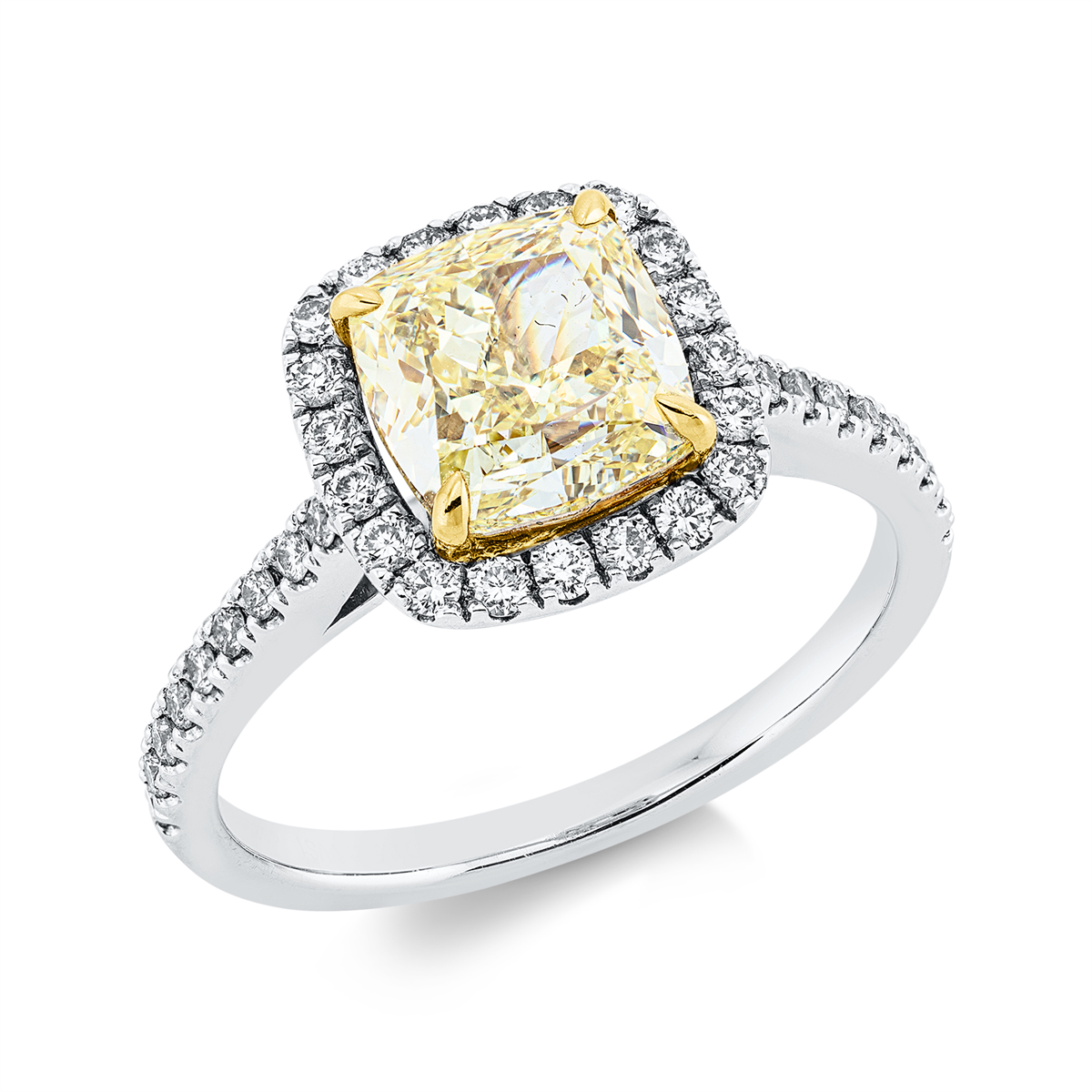Ring 4er-Krappe 950 Pt GP, GIA 5406698330, 1 Cushion 2,50 ct, gelb-vvs, 38 Brillanten 0,35 ct, TW-vsi, Weite:53