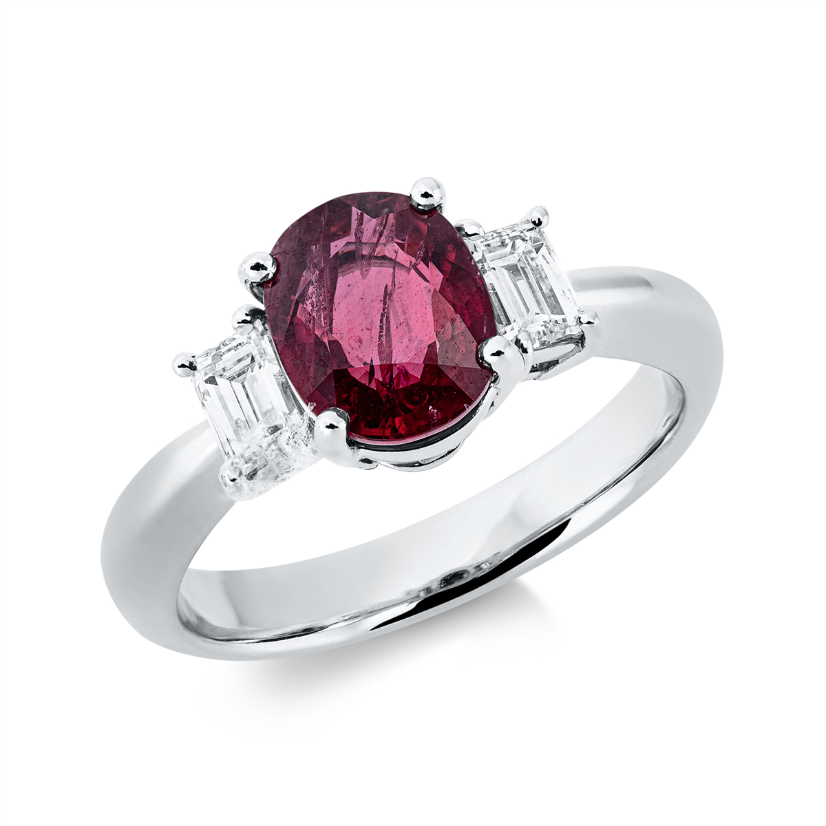 Ring 900 Pt Platin, 2 Sm.schliff 0,45 ct, TW-si, 1 Rubin 2,03 ct rot, Weite:52