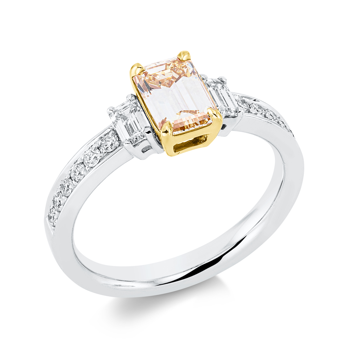 Ring 950 Pt GP, GIA6233023822, 2 Sm.schliff 0,33 ct, TW-vsi, 12 Brillanten 0,17 ct, TW-vsi, 1 Sm.schliff 1,00 ct, gelb, H:9,5 mm, B:7,3 mm, Weite:54