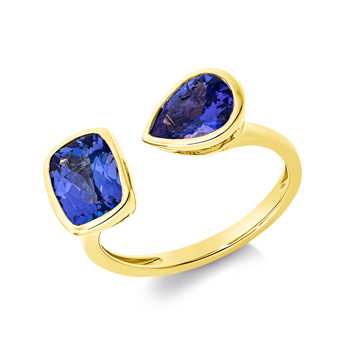 Ring Zarge 14 kt GG, 1 Tansanit 1,39 ct blau, 1 Tansanit 1,07 ct blau, H:18,5 mm, B:9,1 mm, Weite:54