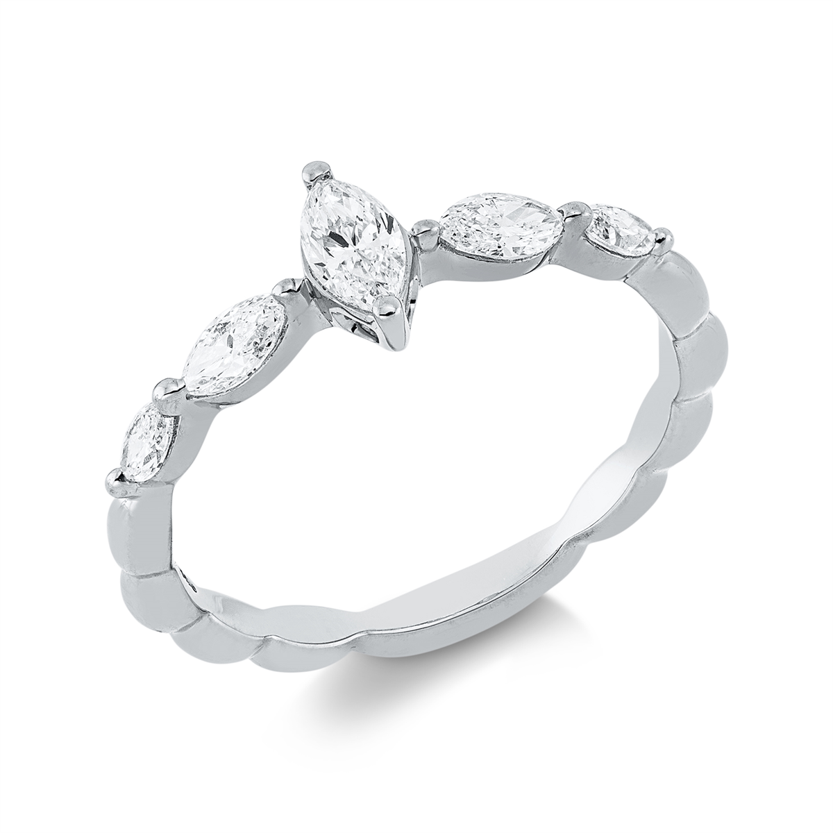 Ring 18 kt GG, 1 Navette 0,21 ct, TW-si, 4 Navette 0,31 ct, TW-si, H:5,9 mm, B:7,3 mm, Weite:54
