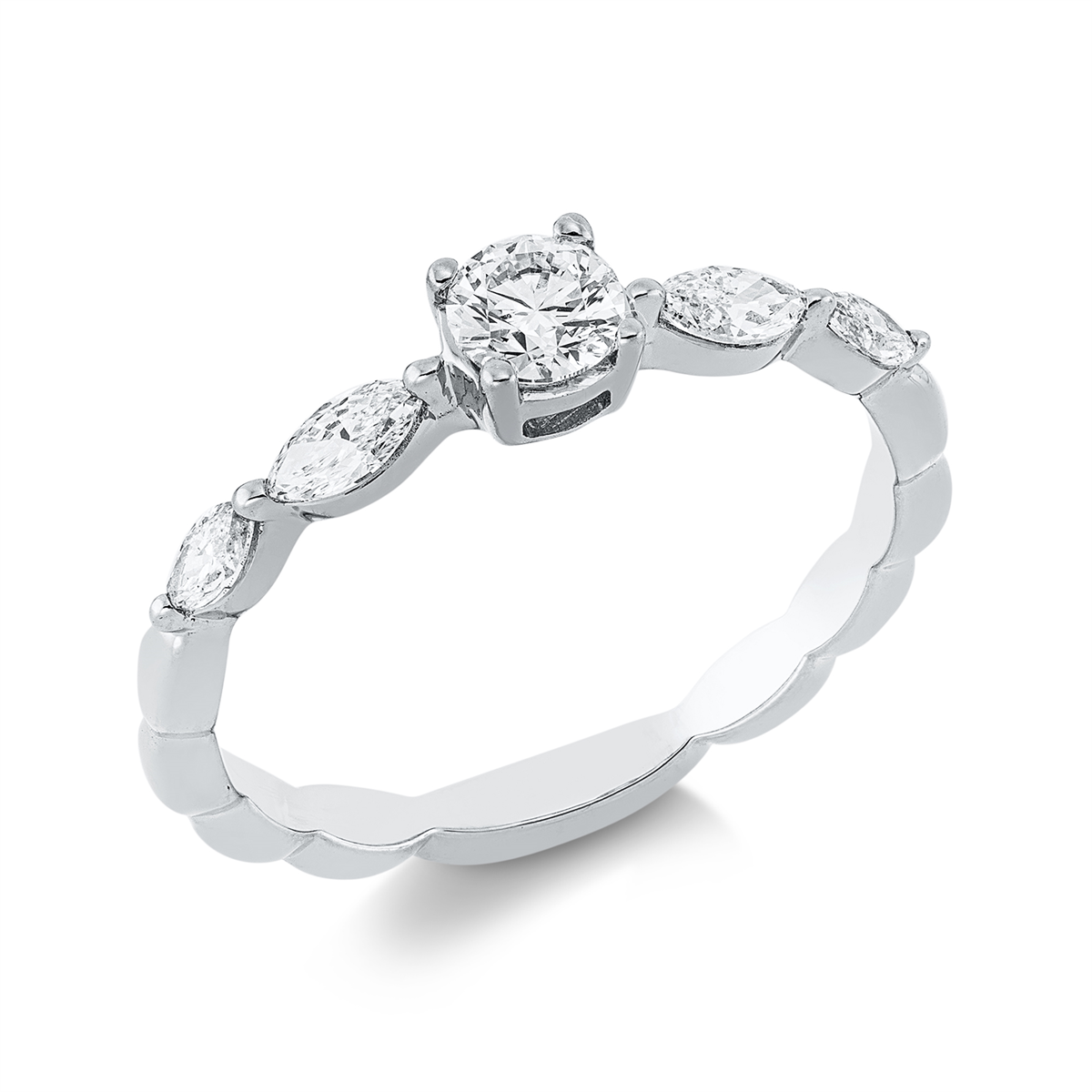 Ring 18 kt GG, 4 Navette 0,29 ct, TW-si, 1 Brill. 0,25 ct, TW-si, H:4,0 mm, B:4,1 mm, Weite:53