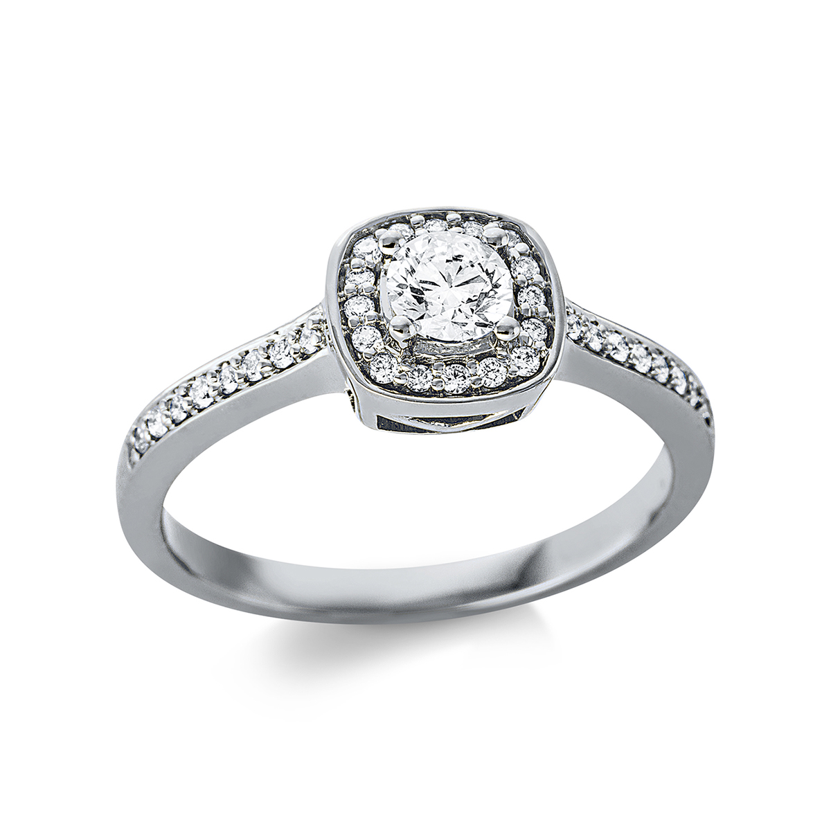 Ring 4er-Krappe 18 kt GG, 1 Brill. 0,29 ct, TW-si, 32 Brillanten 0,17 ct, TW-si, H:7,7 mm, B:7,3 mm, Weite:54