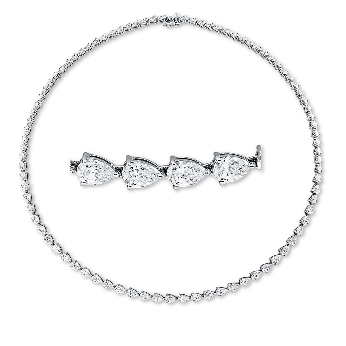 Collier 18 kt WG, 24 Tropfen 5,74 ct, TW-si, 6 Tropfen 1,16 ct, TW-si, 6 Tropfen 1,01 ct, TW-si, 52 Tropfen 4,52 ct, TW-si, L:41,9 cm